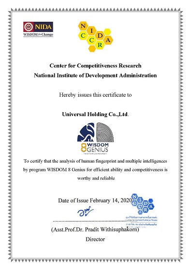 ซึ่งโปรแกรม WISDOM8Genius ได้รับการรับรองด้านคุณค่าและและความน่าเชื่อถือจากศูนย์วิจัยขีดความสามารถในการแข่งขัน สำนักวิจัย สถาบันบัณฑิตพัฒนบริหารศาสตร์ (นิด้า)